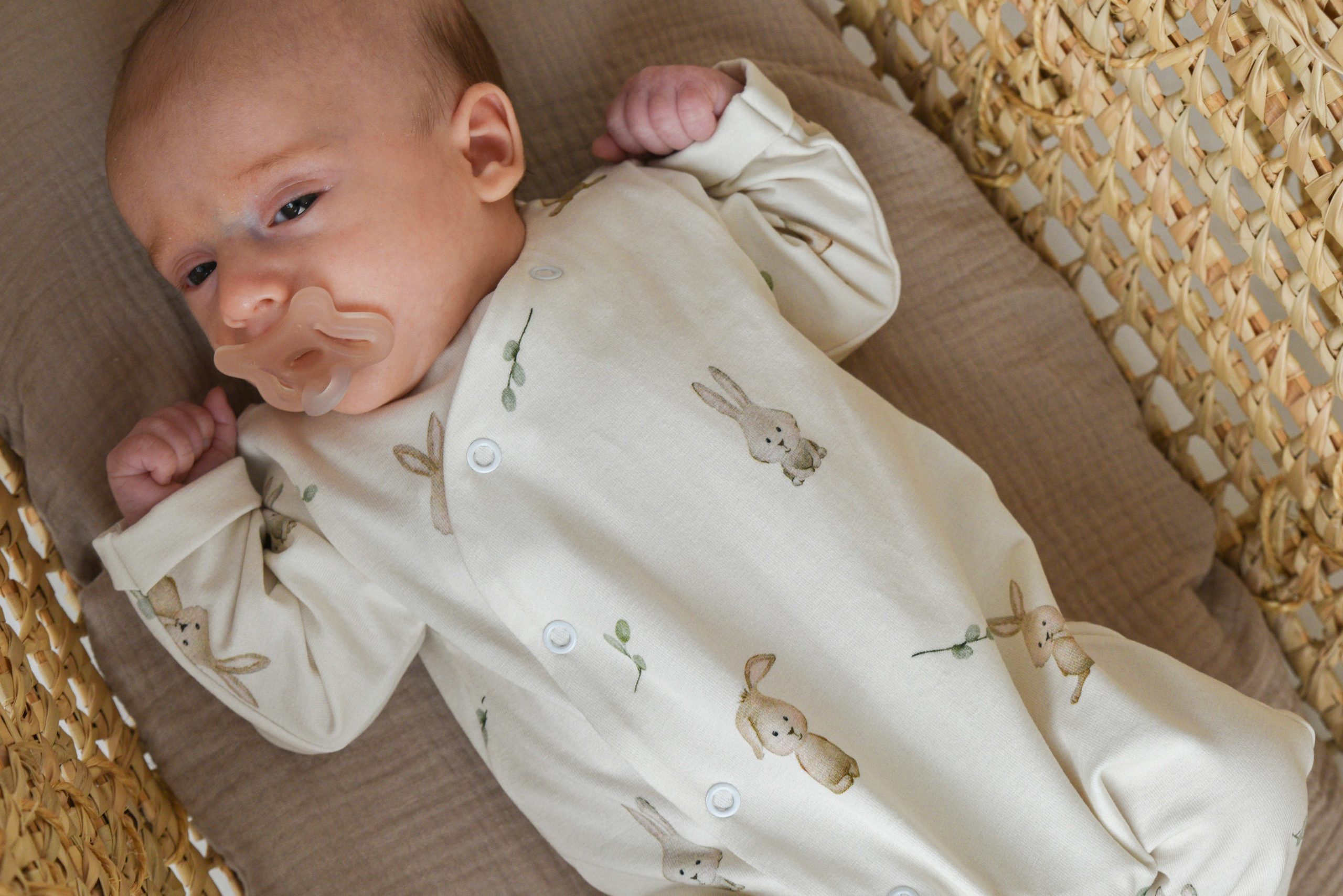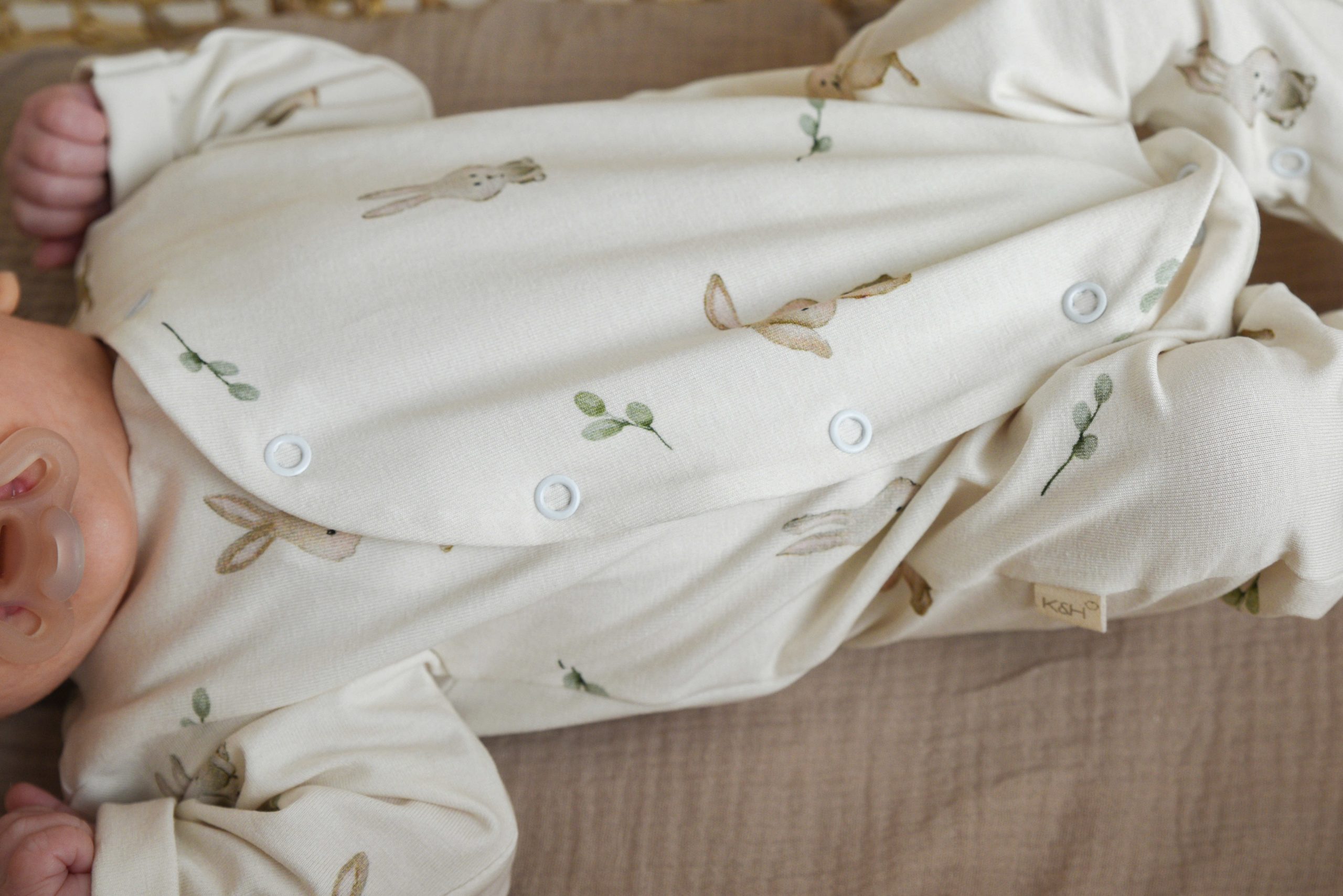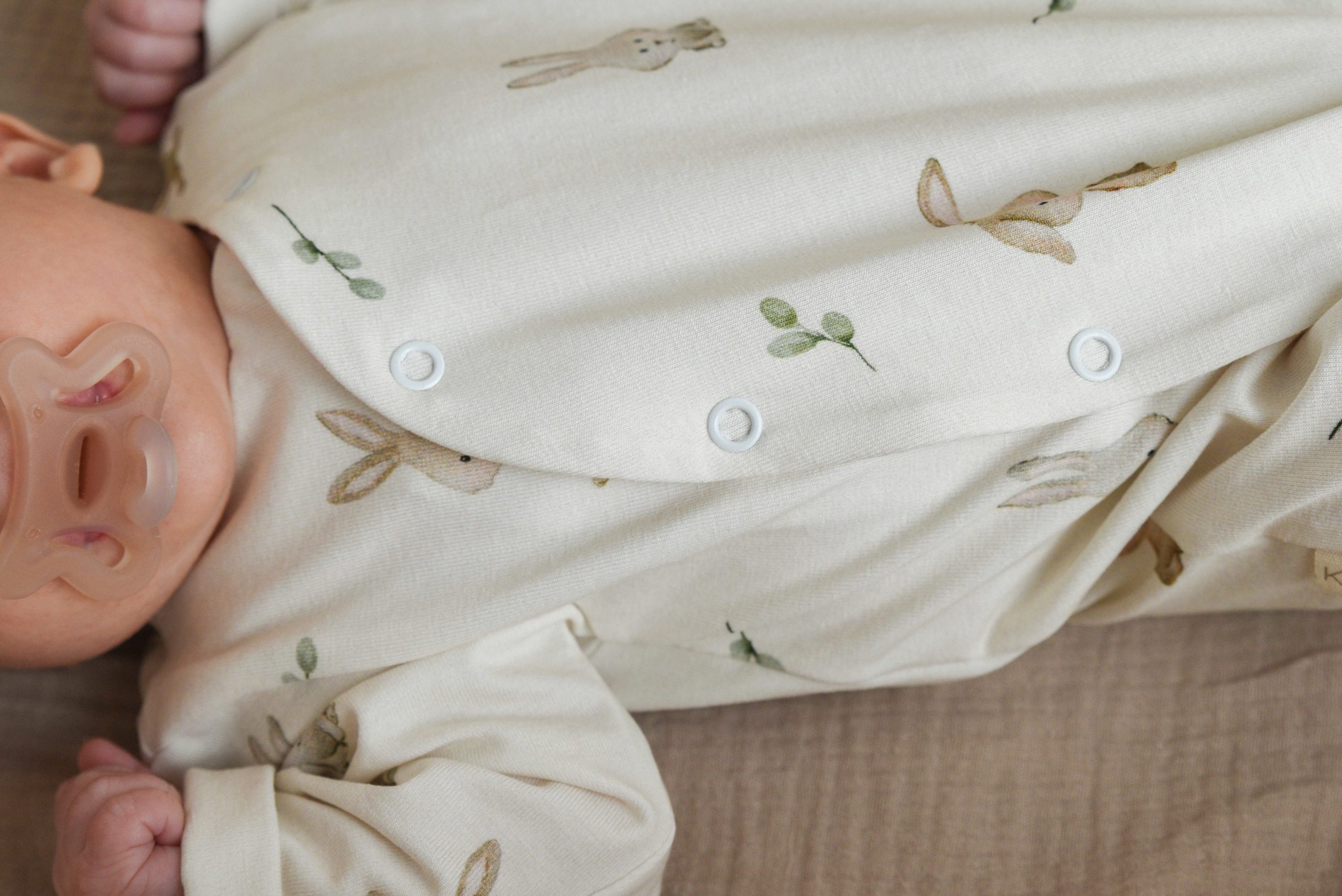 El pelele es una prenda comodísima que no puede faltar cuando nace un bebé. Es de manga larga y se abre completamente con corchetes para que sea súper fácil poner y quitar al bebé.