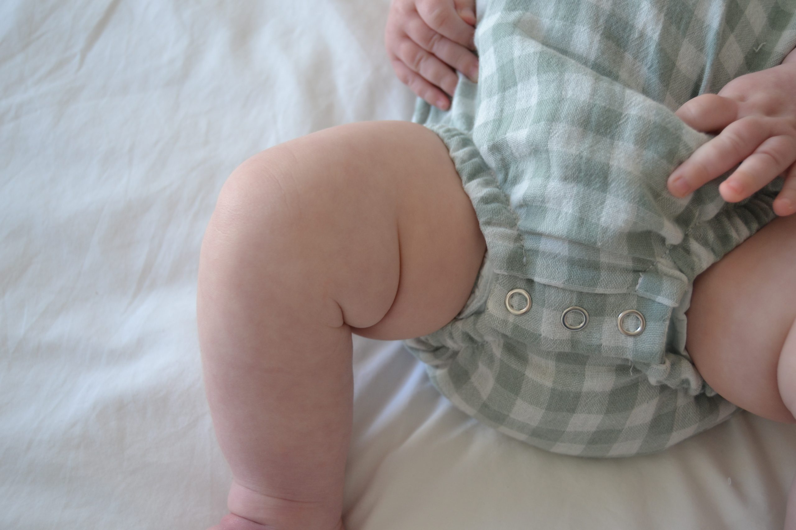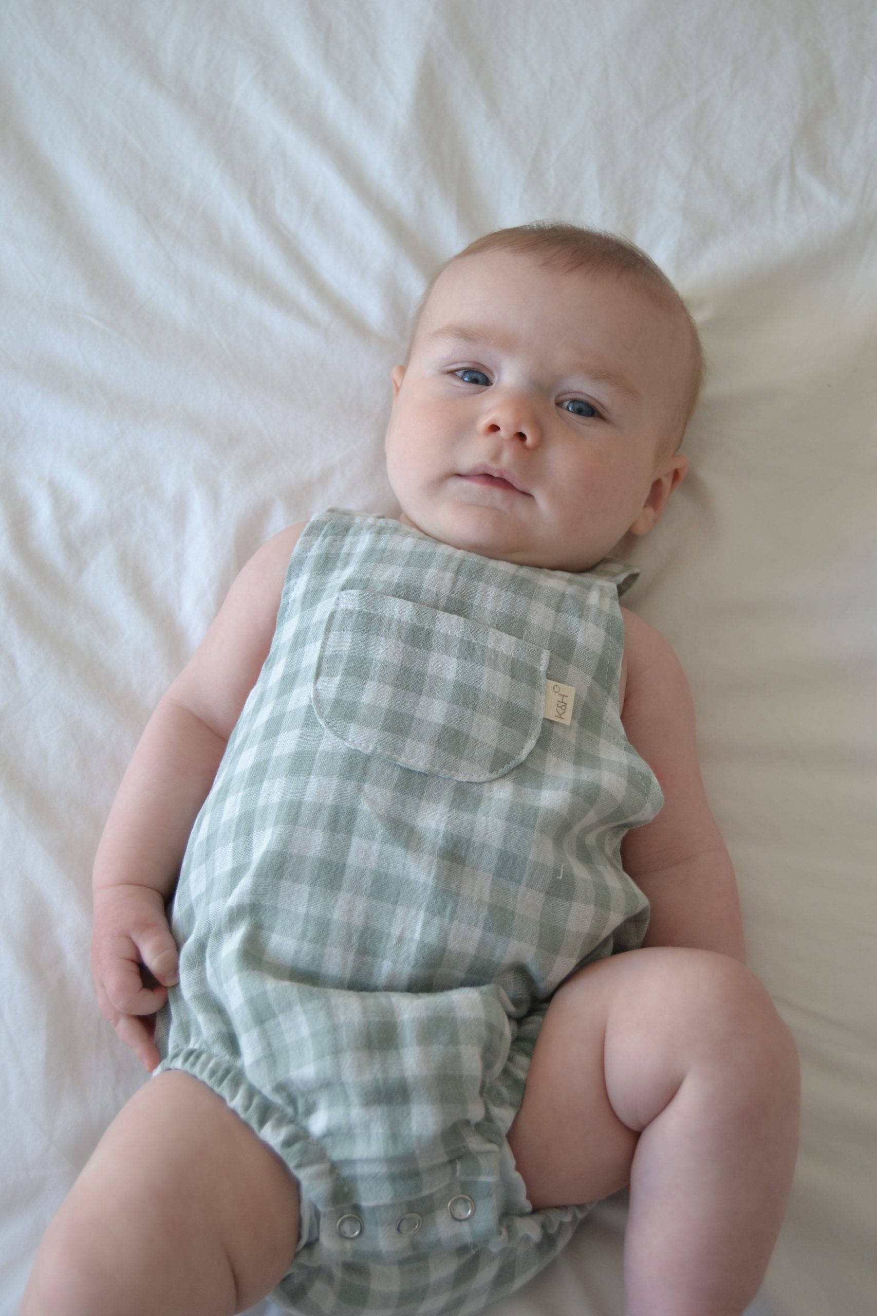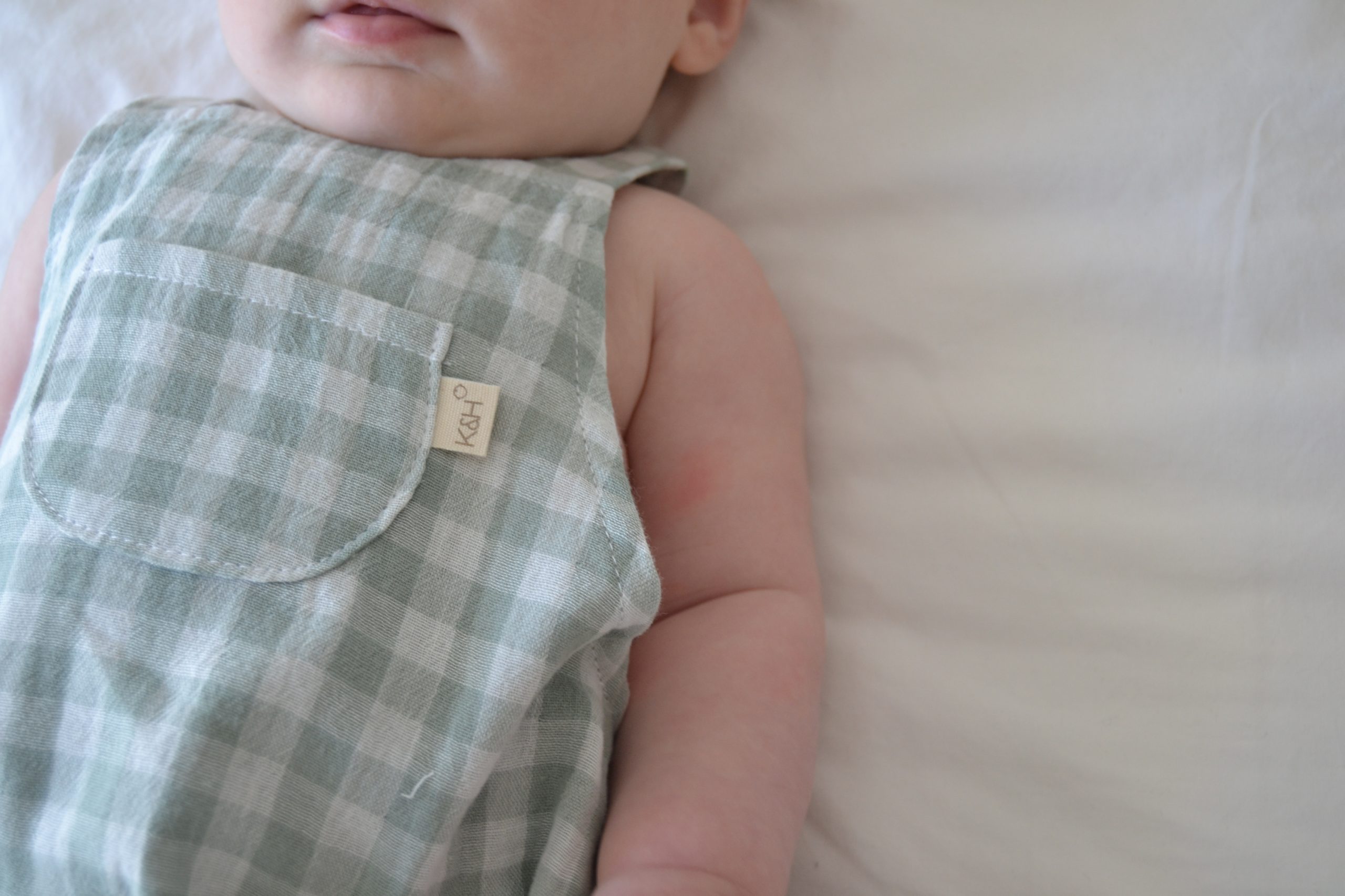 Tiene corchetes en la entrepierna para facilitar el cambio del pañal. Los tirantes se cruzan por la espalda y en cada tirante tiene dos botones de madera natural para regular la talla del bebé.