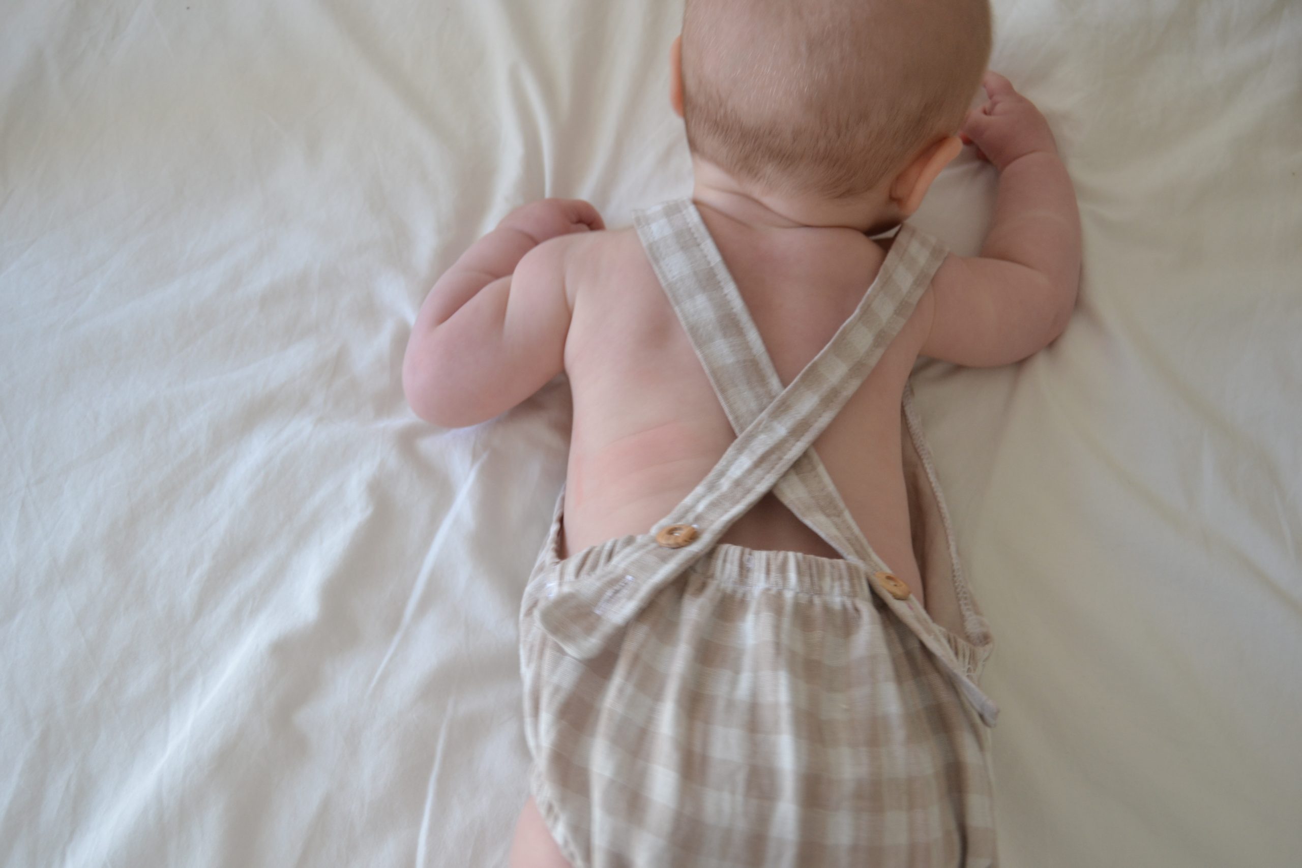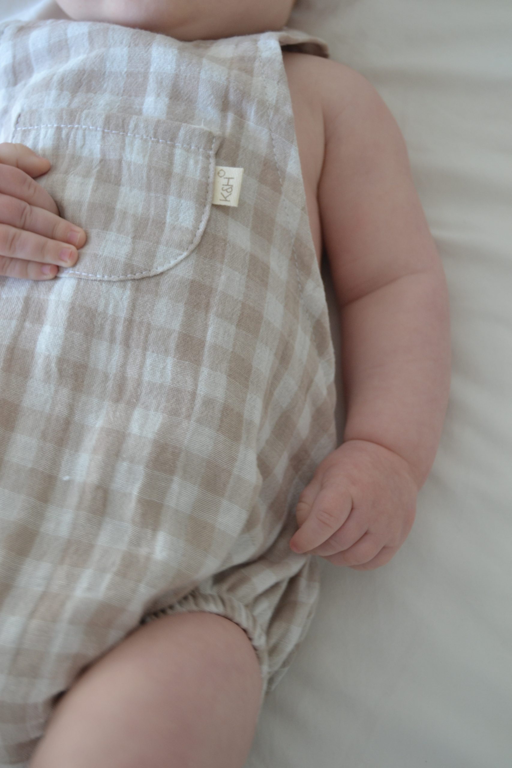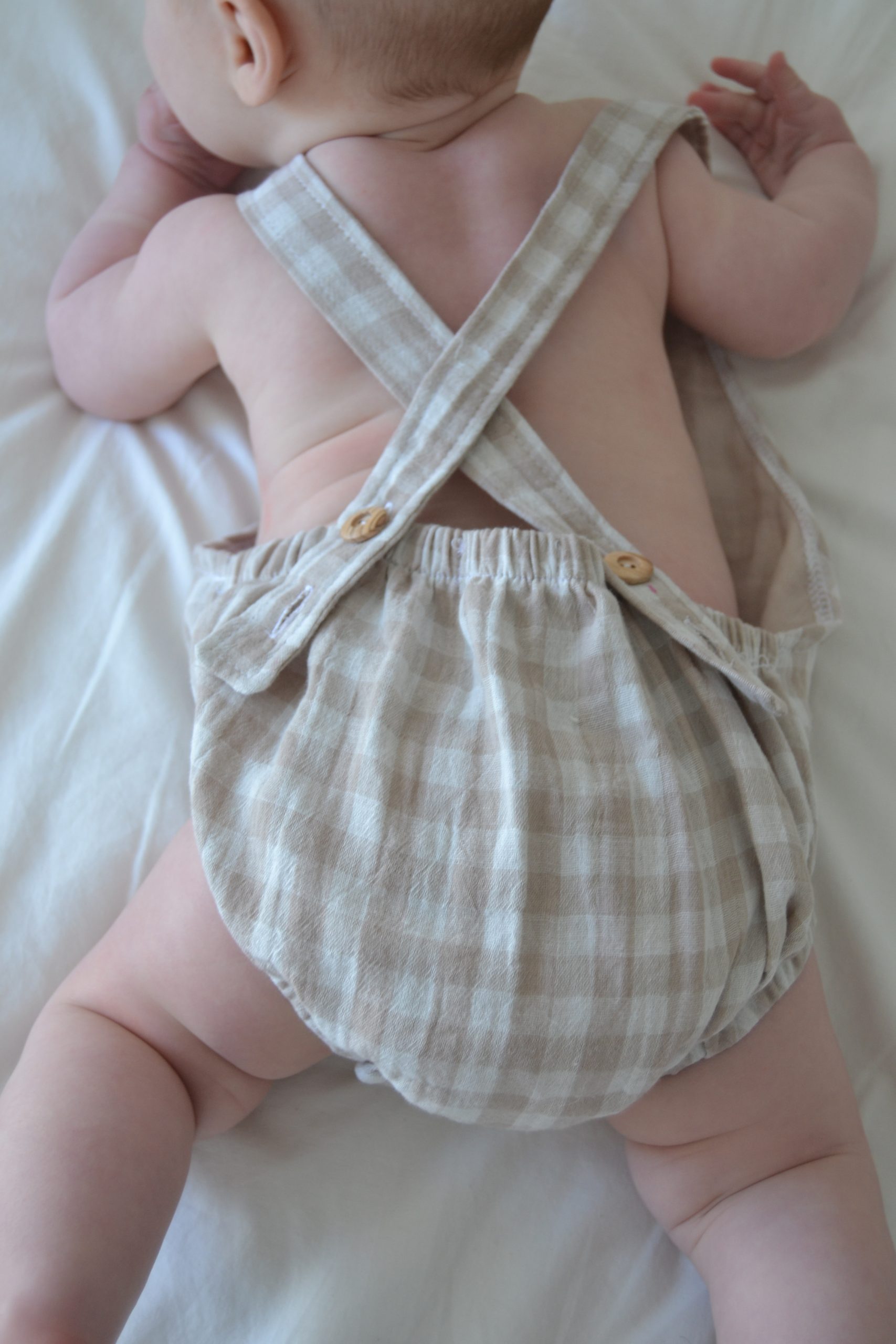 Tiene corchetes en la entrepierna para facilitar el cambio del pañal. Los tirantes se cruzan por la espalda y en cada tirante tiene dos botones de madera natural para regular la talla del bebé.